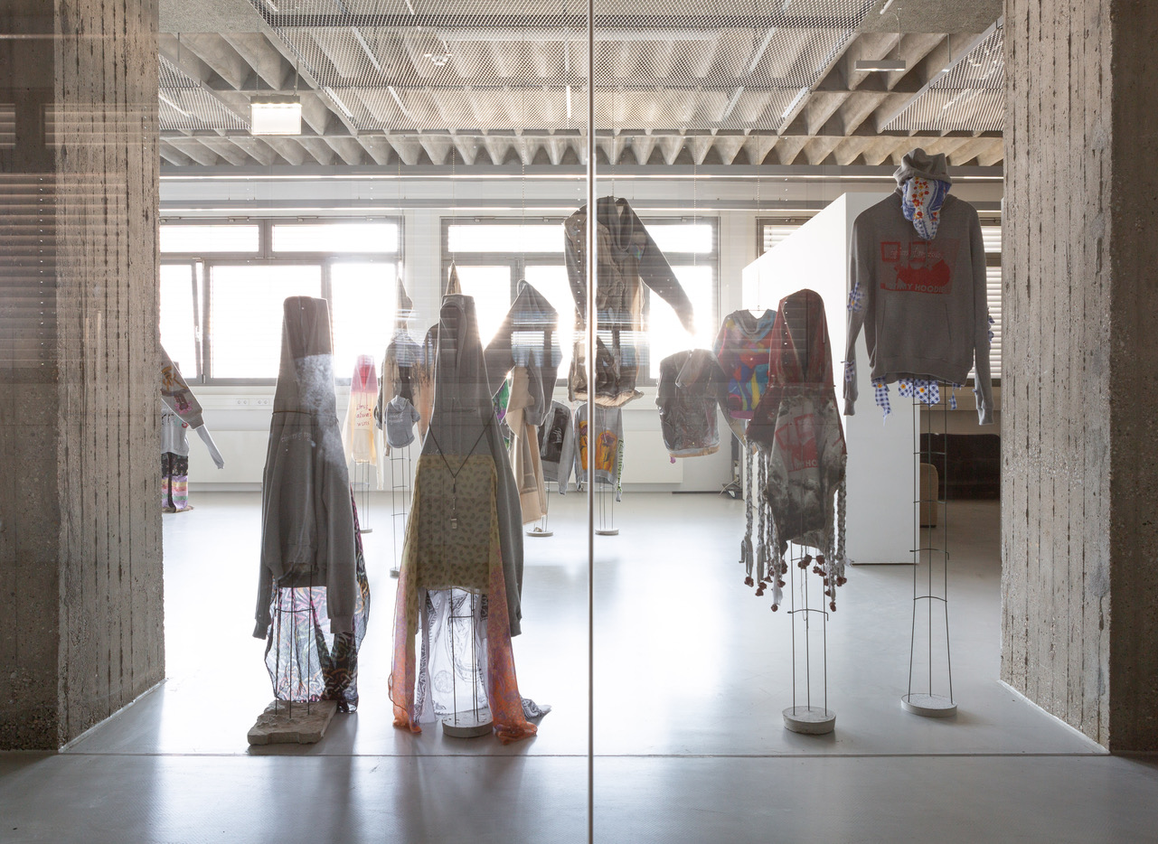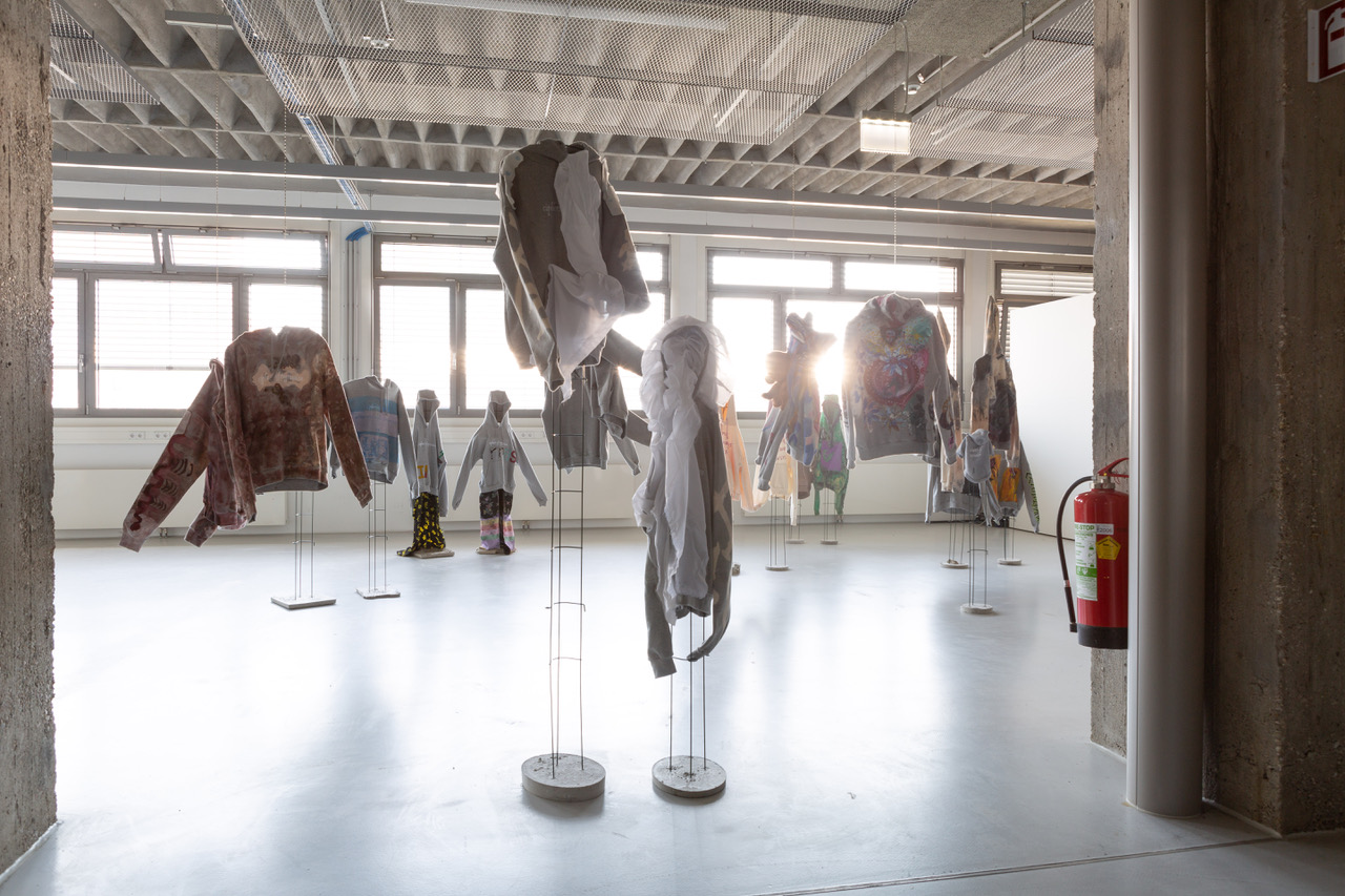 "Ciphers of Regression" (June 25 to 28, 2019) was a project by the Painting Department in collaboration with the Collection of the University of Applied Arts Vienna. It consisted of an auction (June 25, 2019) conducted by Marei Buhmann and Sofie Fatouretchi; musical interludes by Jutta Maris & Reena King, Angst, Die Süsen Mäuse, and In My Talons; an adaption of the exhibition "Der Hausfreund," previously on view at Heiligenkreuzer Hof (May 2 to June 1, 2019); and an exhibition of hoodies. Pairs of hoodies were reworked, of which auction attendees acquired one. The counterpart was