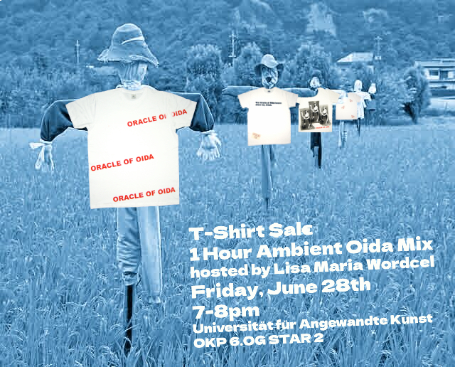 The days may be hot or rainy, the room small, the windows open or closed, you may be sweating, you may need a new shirt, you may need to sit down. Let go of the tension in your muscles. Listening to ambient music might be a good thing to do on a Friday night in late stressful June. The Oracle of Oida will be playing a one-hour mix while selling its last hand-printed limited edition of T-shirts. You might get a discount.